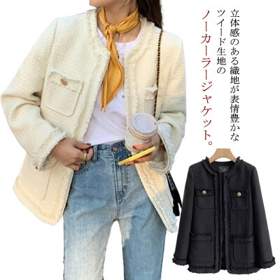 立体感のある織地が表情豊かなツイード生地のノーカーラージャケット。