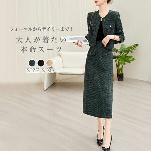 スカートスーツ 2点セット セットアップ レディース ツイード スカート バックスリット ジャケット ノーカラー ロングスカート 長袖 春 秋 レディース ツイードジャケット 着痩せ 女性らしい きれいめ お洒落 上品 オフィス フォーマル 通勤 OL