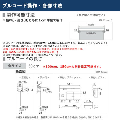 (例:プルコード操作の場合 幅30cmの場合90cmまで作成可能) ※プルコードの長さは標準仕様は全サイズ50cmですが、100cm・150cmにご変更いただけます。